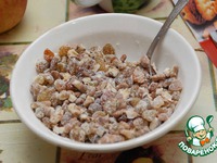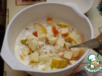 В творожную массу добавляем манку с изюмом и орехами и яблоки, перемешиваем. |