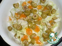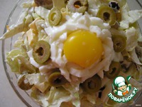 Выкладываем в салатницу. Теперь пригодится яйцо сваренное всмятку. Желток - по центру, и нежные лепестки белка - в обрамление. Пару маслинок дополнят картину. |