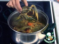 Раков опустите в кипящую воду, добавьте коренья, лук, специи, укроп и варите 8-10 минут. |