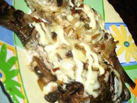 когда лук будет готов, смешиваем его с грибами и начиняем рыбку.