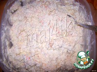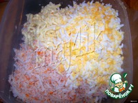 Начинка: Яйца сварить. В мисочку натереть крабовые палочки. Туда же добавить натёртые варёные яйца и натёртые плавленные сырки. |