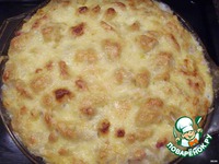 Берем форму для запекания, выкладываем туда наши макарошки, заливаем все луково-сырным соусом. |