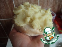 Берем 1 грудку и с одной стороны накладываем на нее картофельное пюре. |