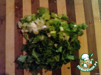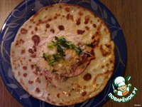 На горячий блин укладываем: ветчина (4 полосочки), шампиньоны, сыр, зелень. |