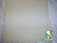Стол присыпать мукой, выложить пласт слоеного теста и немного раскатать. |