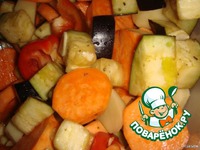 Овощи моем, чистим, картофель и батат режем кружками, перец крупными кусочками. С баклажана я кожу не снимала и горечь не выпускала! Овощи солим, присыпаем приправами, сбрызгиваем оливковым маслом. |