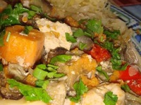 Все это разнообразие вкуса и цвета складываем в рукав, завязываем и отправляем в духовку, минут на 60, на 180 градусов. |