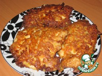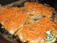 Берем кусочки грудки, обмакиваем их в яично-морковную смесь и кладем на сковородку с разогретым растительным маслом (при этом морковка окажется с двух сторон, она как бы прилипает к кусочку мяса). |