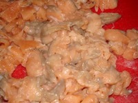 Режем его на тоненькие пластиночки.Можно пропустить через мясорубку,измельчить в блендере.Мне вот хотелось кусочки такого размера,чтоб в полной мере насладиться вкусом лосося. |