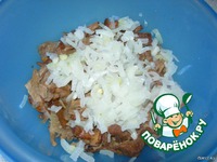 Грибы обжариваем с 1 нарезанной луковичкой при min растительного масла, остужаем, выкладываем в салатник. |