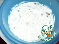 Вторую луковичку нарезаем, заливаем кипятком на 5 минут, затем промываем холодной водой, отжимаем и выкладываем вторым слоем |