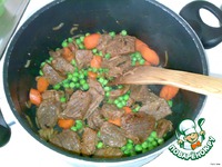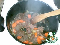Мясо заливаем водой, солим и оставляем готовиться на среднем огне до полной мягкости, потом добавляем подсолнечного масла, лук и морковь. Жарим до готовности моркови |