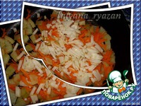 Кабачки нарезать кубиками (у меня были замороженные). В сковороду налить растительное масло, выложить кабачки, добавить немного воды, поставить тушиться. |