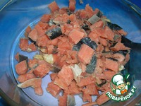 Рыбу чистим, отделяем филе, я шкуру не убираю, это на любителя (мне нравится её вкус). Филе (лучше подмороженное) режем на мелкие кусочки. |