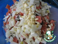 Мелко режем лук, чеснок, добавляем в рыбу. |