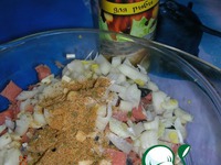 Добавляем соль, приправу. Приправу использую для рыбы - её состав: мелисса, чеснок, белый перец, зелень петрушки, укроп, белая горчица, лук, лавровый лист, цедра лимона, лимонная кислота, соль. |