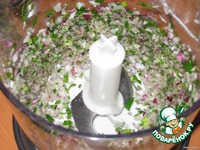 Лук, зелень петрушки и укропа также перекрутить на мясорубке или в блендере. |