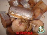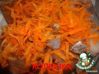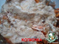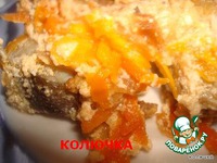 В посуду выкладываем рыбу, сверху тертую морковку... |
