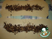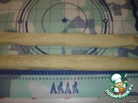 Тесто раскатать на две полосы и выложить на них по всей длине начинку поделив пополам |