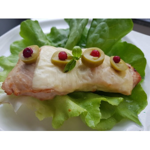 На куриную котлету выложить ломтик сыра и разрезанные на 2 части маслины.