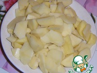 В это время чистим и нарезаем картофель в произвольном порядке. Через пол часа всыпаем его в кастрюлю. |