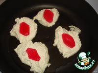 На предварительно разогретую сковородку с растительным маслом ложкой выложить тесто. В центре сделать ложкой небольшие углубления и в каждое положить по кусочку мармелада. |