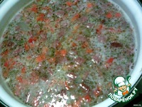 Выкладываем лук и перец солим, добавляем специи доводим до кипения выключаем огонь |
