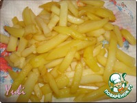 Картофель фри (у меня быстрозамороженный) обжарить на сковороде с добавлением растительного масла до золотистой корочки 10-12 мин. Выложить на бумажные салфетки и немного просушить. |
