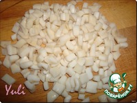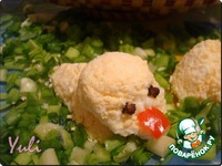 Размещаем уточку на блюде. Внизу "стелем" травку из лука. Из двух шариков делаем утенка: глазки-гвоздика (целая), клюв вырезаем из помидора. |