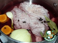 Отварить мозги 20 мин в бульоне из уксуса (100 г) + воды (400 г) или в вине белом или красном, добавив лук, морковь, чеснок, зерна перца, лавровый листик. |
