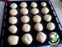 Тесто положить в смазанную растительным маслом кастрюлю, накрыть пленкой и поставить в теплое место для подъема на 1-1,5 часа. Подошедшее тесто разделить на порции размером с куриное яйцо. |