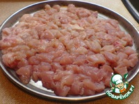 Нарезаем курочку, солим-перчим, выкладываем на противень |