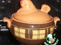 Режем на порционные кусочки курицу. Закладываем в горшочек. |