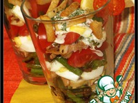 Выложить все ингредиенты слоями в произвольном порядке или аккуратно перемешать. Перед подачей к столу посыпать гренками и полить соусом. Приятного аппетита! |