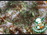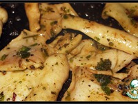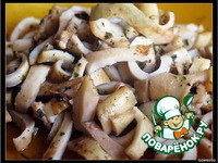 Разрезать кальмар на пластины, сделать ножом насечки и обвалять в смеси петрушки, базилика и красного перца. |