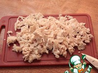Отвариваем куриное филе, остужаем и мелко нарезаем. Отправляем в емкость, в которой будете перемешивать (советую взять кастрюлю :)) |