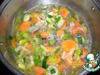 Когда лук-порей станет прозрачным, добавляем горошины перца, лаврушку и ягоды можжевельника. Заливаем вином и бульоном (я делаю бульон из кубиков). Ждeм, когда закипит. |