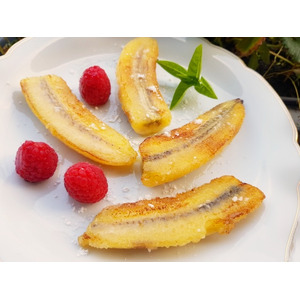 Выложить бананы на блюдо, полить лимонным соком, посыпать сахарной пудрой.