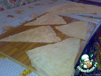 Затем берем 3 лаваша каждый смазываем белком добавленный ¼ стакана растительное масло, немного солим, кладем друг на друга и разрезаем на восемь частей.