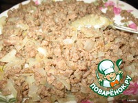 Обжаренные лук и фарш соединяем и перемешиваем. Начинка готова. |