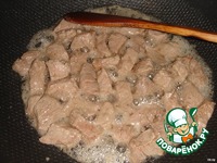 Мясо порезать кусочками, нагреть в толстодонной сковороде или вок масло и обжарить кусочки мяса до румяной корочки. После вынуть и отставить. |