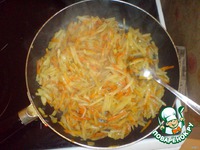 Пока тесто остужается, берем наши овощи. Картофель и морковь трём на тёрке, лук мелко режем. |