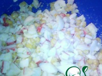 берём крабовые палочки, режем на маренькие кусочки.варим яйца, потом тоже режем на маленькие кусочки, берём кукурузу, добовляем. |
