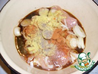 Картофель отварить в мундире, остудить, почистить и нарезать соломкой на мяско. Полить оставшимся маринадом. Посыпать приправой для картофеля, смазать майонезом и посыпать тертым сыром. |