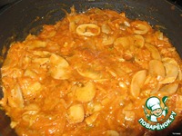 Обжарить лук, добавить натертую морковку и грибы (у меня были резанные шампиньоны). Кладем столовую ложку томатной пасты. |