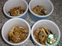 Баклажаны раскладываем по формам. Они у меня нарезаны соломкой. Я покупала заморозку. Можно использовать свежие. |