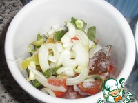 Затем кладем болгарский перец. У меня свой с дачи, нарезан соломкой. Можно заменить на свежий |