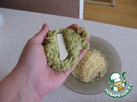 На ладошку выложить фарш и положить полоску тофу. Сформировать котлетку и обвалять в сухарях. |