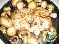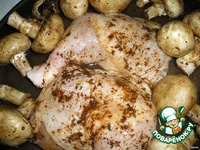 Курочку разморозить. Обмазать специями. Шампиньоны помыть и тоже измазать. Полить соевым соусом. Оставить на пару часиков. |