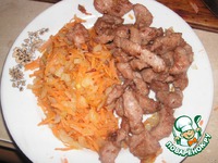 На терке для корейской моркови натираем морковь (простите за тавтологию), лук нарезаем мелко, обжариваем на масле. После обжариваем мясо - это называется тясю |